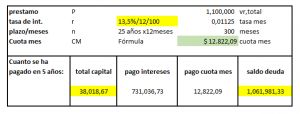La entidad financiera X otorga un préstamo hipotecario por valor de S/1.100.000 a una tasa de 13.5% anual y un plazo de 25 años.